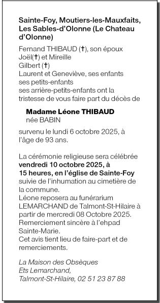Décédée à Talmont-Saint-Hilaire (85440, France) le lundi 6 octobre 2025 à l'âge de 93 ans