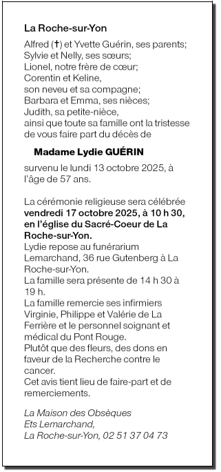 Décédée à La Roche-sur-Yon (85000, France) le lundi 13 octobre 2025 à l'âge de 57 ans
