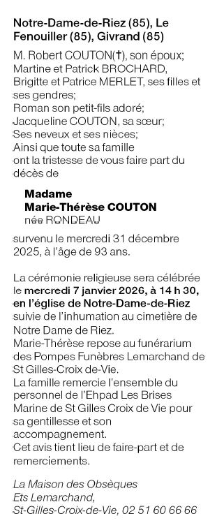 | Domiciliée à Saint-Gilles-Croix-de-Vie (85800, France) Née à Notre-Dame-de-Riez (85270, France) le samedi 8 octobre 1932 Décédée à Saint-Gilles-Croix-de-Vie (85800, France) le mercredi 31 décembre 2025 à l'âge de 93 ans Veuve de Monsieur Robert COUTON