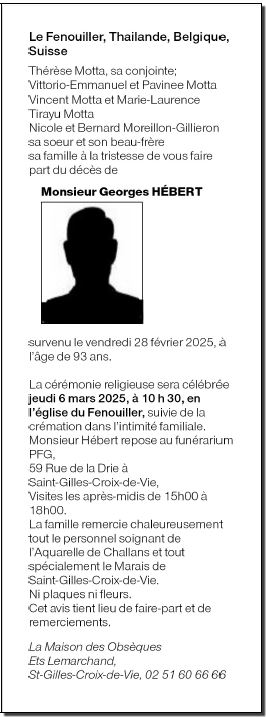 Décédé à Saint-Gilles-Croix-de-Vie (85800, France) le vendredi 28 février 2025 à l'âge de 93 ans