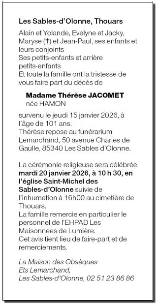 Décédée à Les Sables d'Olonne