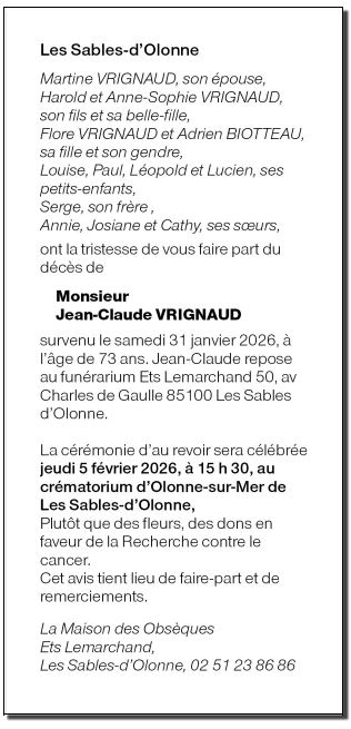 le samedi 31 janvier 2026 à l'âge de 73 ans