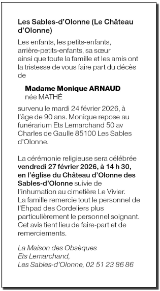 | Madame Monique ARNAUD née MATHÉDomiciliée à Les Sables d'Olonne (85100, France) Née à Les Sables d'Olonne (85100, France) le mardi 31 décembre 1935 Décédée à Les Sables d'Olonne (85100, France) le mardi 24 février 2026 à l'âge de 90 ans Veuve de Monsieur Robert ARNAUD