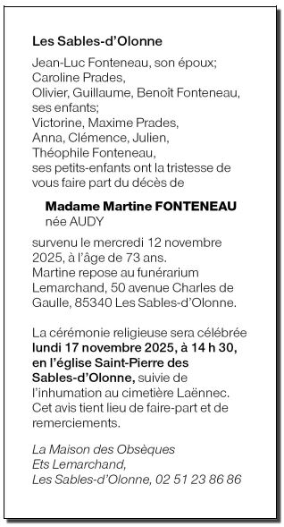 | Madame Martine FONTENEAU née AUDYDomiciliée à Les Sables d'Olonne (85100, France) Née à Orléans (45000, France) le vendredi 12 septembre 1952 Décédée à Les Sables d'Olonne (85180, France) le mercredi 12 novembre 2025 à l'âge de 73 ans Epouse de Monsieur Jean-Luc FONTENEAU