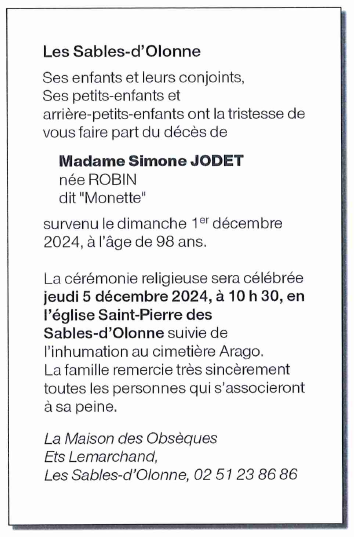 le dimanche 1 décembre 2024 à l'âge de 98 ans