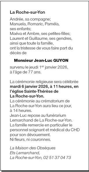 Décédé à La Roche-sur-Yon (85000, France) le jeudi 1 janvier 2026 à l'âge de 77 ans